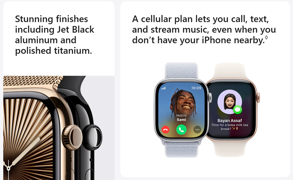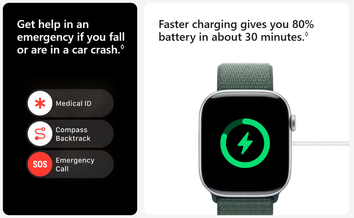 International Emergency Calling: Requires Apple Watch Series 7, SE, Ultra, or later. For a list of supported countries and regions, see apple.com/watchos/feature‑availability.