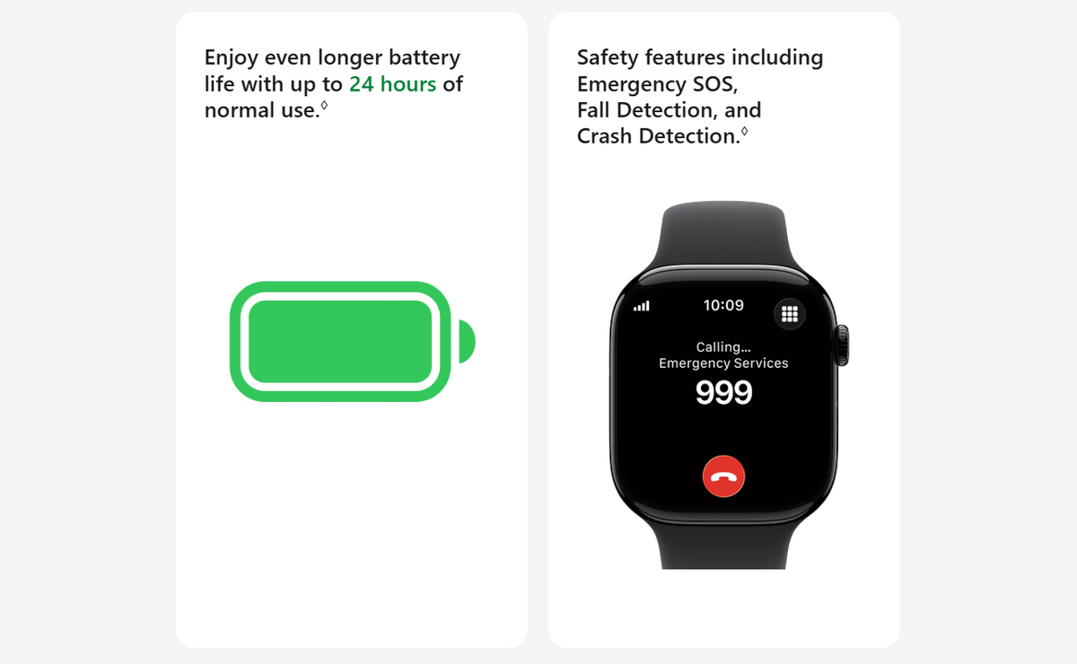 International Emergency Calling: Requires Apple Watch Series 7, SE, Ultra, or later. For a list of supported countries and regions, see apple.com/ae/watchos/feature‑availability.