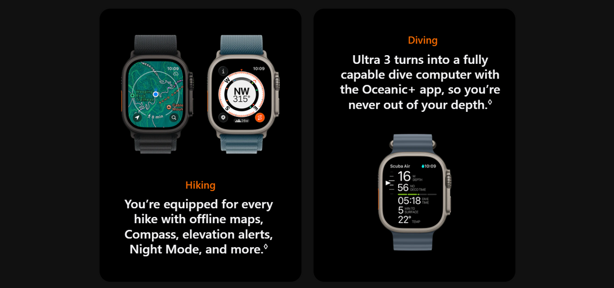Oceanic+ App: A subscription is required for Oceanic+. Available on the App Store. Apple Watch Series 11 supports snorkeling to 6m; Apple Watch Ultra 3 supports recreational scuba diving to 40m. Always follow diving protocols and dive with a companion and have a secondary device.