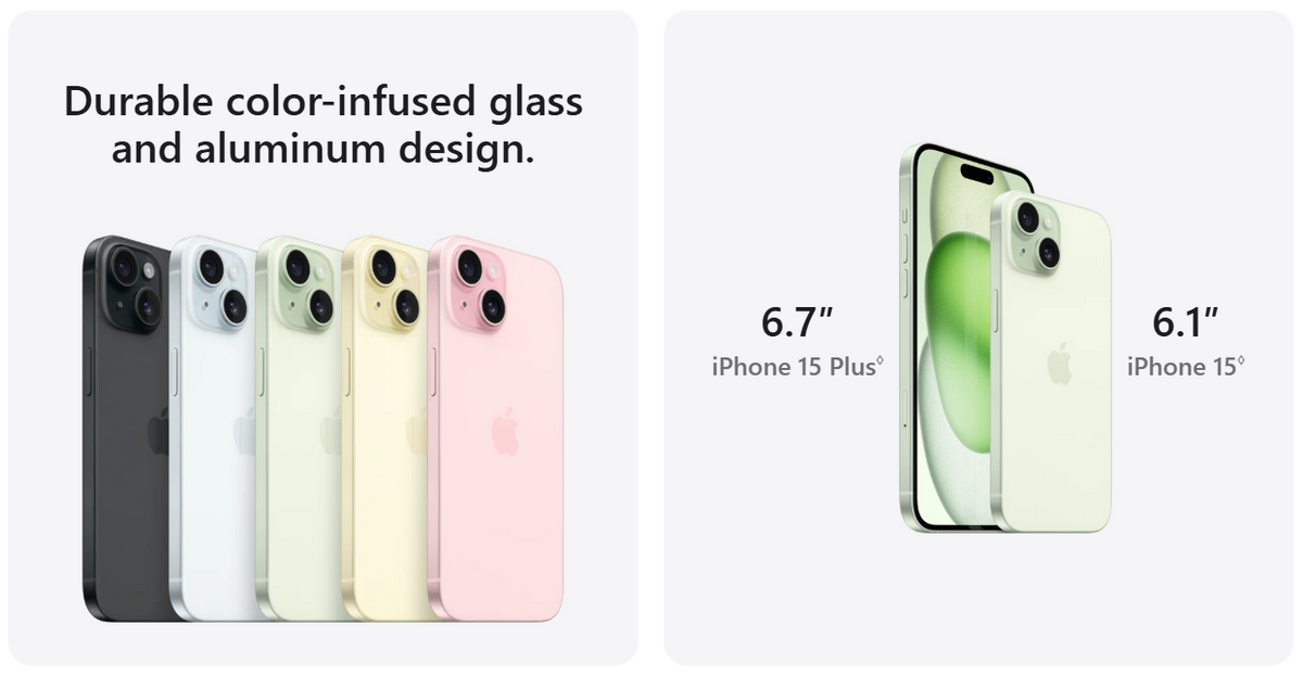 Display Size: The display has rounded corners that follow a beautiful curved design, and these corners are within a standard rectangle. When measured as a standard rectangular shape, the screen is 6.12 inches (iPhone 15 Pro, iPhone 15) or 6.69 inches (iPhone 15 Pro Max, iPhone 15 Plus) diagonally. Actual viewable area is less.