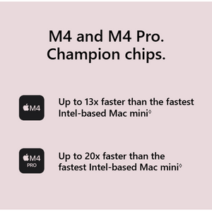 Up to 20x Faster than the Fastest Intel‑Based Mac mini (Intel‑Based, 2018) for Mac mini (M4 Pro): Testing conducted by Apple in September and October 2024 using preproduction Mac mini systems with Apple M4 Pro, 14‑core CPU, 20‑core GPU, 64GB of RAM, and 8TB SSD, and production 3.2GHz 6‑core Intel Core i7‑based Mac mini systems with Intel Iris UHD Graphics 630, 64GB of RAM, and 2TB SSD. Tested with MacWhisper v9.13 using a 10‑minute and 30‑second MP3. Performance tests are conducted using specific computer systems and reflect the approximate performance of Mac mini.