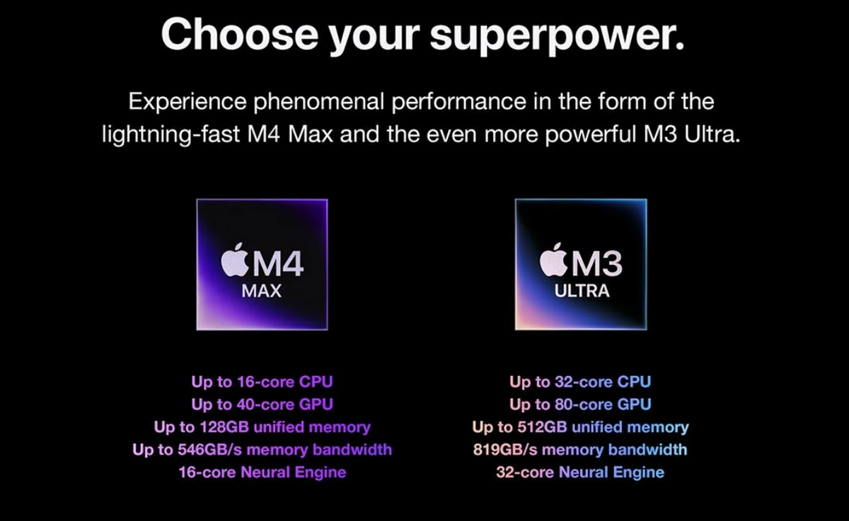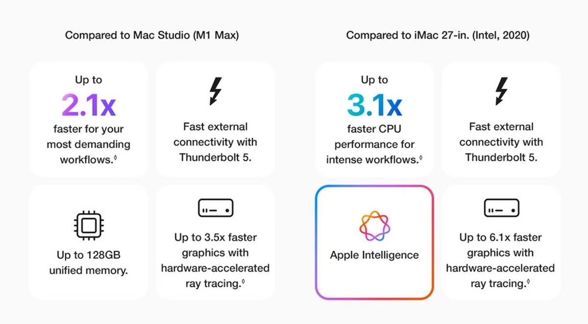 Up to 2.1x Faster than Mac Studio with M1 Max: Testing conducted by Apple in January and February 2025 using preproduction Mac Studio systems with Apple M4 Max, 16-core CPU, 40-core GPU, and 128GB of RAM, production Mac Studio systems with Apple M2 Max, 12-core CPU, 38-core GPU, and 96GB of RAM, and production Mac Studio systems with Apple M1 Max, 10-core CPU, 32-core GPU, and 64GB of RAM, as well as production 3.6GHz 10-core Intel Core i9-based 27-inch iMac systems with Radeon Pro 5700 XT graphics with 16GB of GDDR6, and 128GB of RAM. All systems configured with 8TB SSD. Open source project built with Xcode 16.2 with Apple Clang 16.0.0, Ninja 1.10.0 git, and CMake 3.26.4. Mac Studio systems tested with an attached 5K display. Performance tests are conducted using specific computer systems and reflect the approximate performance of Mac Studio and iMac.