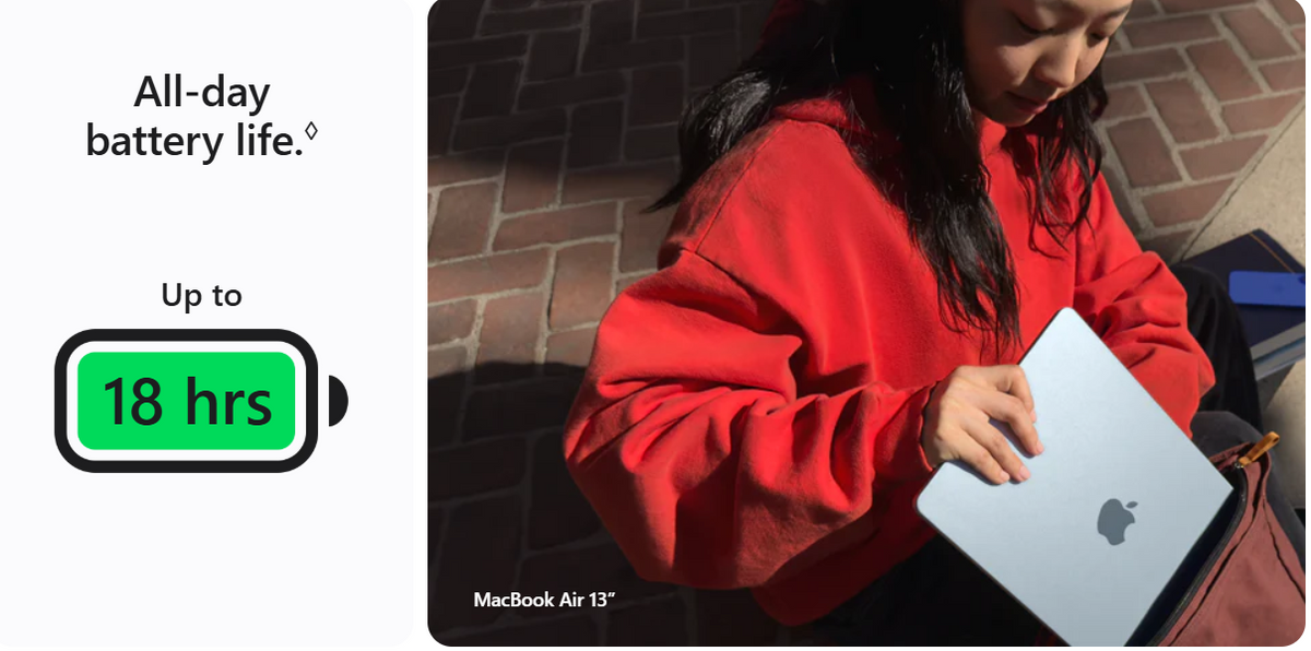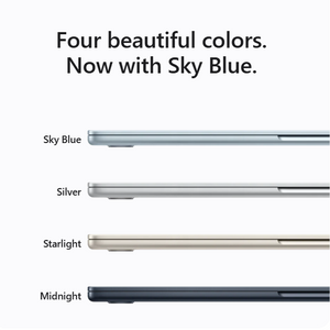 MacBook Air with the M4 chip lets you blaze through everything you’re into while delivering up to 18 hours of battery life.◊Refer to legal disclaimers.And you have four gorgeous colors to choose from, including a stunning Sky Blue. With the perfectly portable MacBook Air, you’ll be ready to take on just about anything, anywhere.