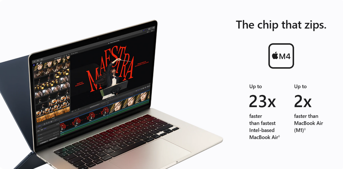 Up to 23x Faster than the Fastest Intel‑Based MacBook Air (Intel, 2020): Testing conducted by Apple in January 2025 using preproduction 13‑inch and 15‑inch MacBook Air systems with Apple M4, 10‑core CPU, 10‑core GPU, and 32GB of RAM, as well as production 1.2GHz quad‑core Intel Core i7‑based MacBook Air systems with Intel Iris Plus Graphics and 16GB of RAM, all configured with 2TB SSD. Tested using Super Resolution with Pixelmator Pro 3.6.14 and a 4.4MB image. Performance tests are conducted using specific computer systems and reflect the approximate performance of MacBook Air.