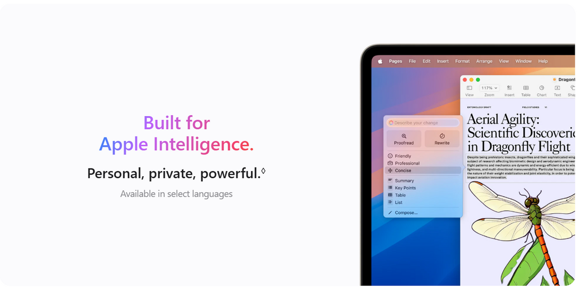 Apple Intelligence: Apple Intelligence is available in beta on all Mac models with M1 and later, with Siri and device language set to Chinese (Simplified), English (Australia, Canada, India, Ireland, New Zealand, Singapore, South Africa, UK, or U.S.), French, German, Italian, Japanese, Korean, Portuguese (Brazil), or Spanish, as a macOS Sequoia update, with more languages coming over the course of the year, including Vietnamese. Some features may not be available in all regions or languages.