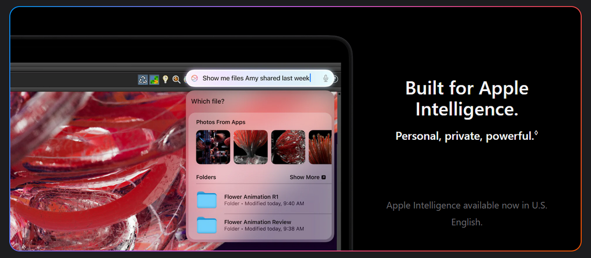 Apple Intelligence: Apple Intelligence is available in beta on all Mac models with M1 and later, with Siri and device language set to U.S. English, as a macOS Sequoia update. English (Australia, Canada, Ireland, New Zealand, South Africa, UK) language support available December 2024. Some features and support for additional languages, like Chinese, English (India, Singapore), French, German, Italian, Japanese, Korean, Portuguese, Spanish, Vietnamese, and others, will be coming over the course of the next year
