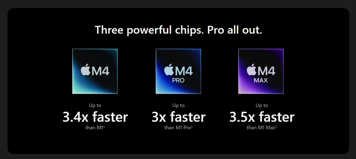 Up to 3.5x Faster than MacBook Pro with M1 Max: Testing conducted by Apple August through October 2024 using preproduction 14‑inch MacBook Pro systems with Apple M4 Max, 16‑core CPU, 40‑core GPU, and 128GB of RAM, and production 14‑inch MacBook Pro systems with Apple M1 Max, 10‑core CPU, 32‑core GPU, and 64GB of RAM, all configured with 8TB SSD. Prerelease Redshift v2025.0.0 tested using a 29.2MB scene utilizing hardware‑accelerated ray tracing on systems with M4 Max. Performance tests are conducted using specific computer systems and reflect the approximate performance of MacBook Pro.
