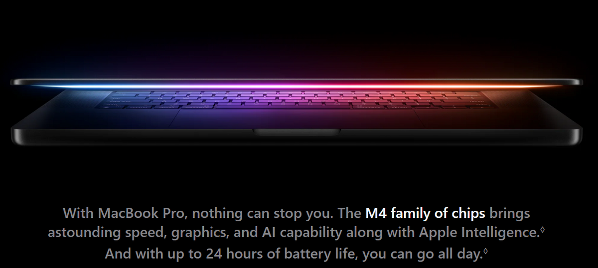 Up to 14 More Hours Battery Life (Up to 24 Hours Total): Testing conducted by Apple August through October 2024 using preproduction 14‑inch MacBook Pro systems with Apple M4, 10‑core CPU, 10‑core GPU, 24GB of RAM, and 1TB SSD. Wireless web battery life tested by browsing 25 popular websites while connected to Wi‑Fi. Video streaming battery life tested with 1080p content in Safari while connected to Wi‑Fi. Display brightness set to 8 clicks from the bottom and keyboard backlight was off. Battery life varies by use and configuration. See apple.com/ae/batteries for more information.